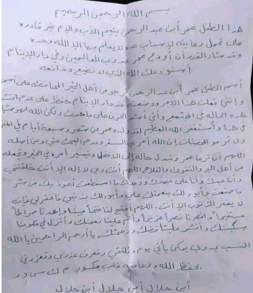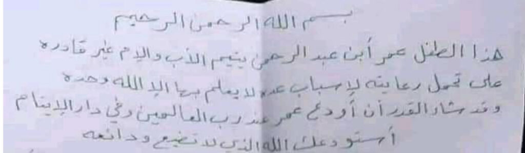 وشرحت الأم في كاتبتها داخل الورقة أسباب إقدامها على هذا الفعل من إيداع الطفل في دار أيتام رغم حداثة عمره قائلة: “اسم الطفل عمر ابن عبدالرحمن نرجو من أهل الخير المحافظة على اسمه وأنني فعلت هذا الأمر ووضعته عند دار الأيتام حفاظاً على عدم انتشار هذه الحالة في