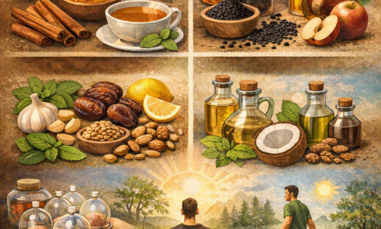 - الطب النبوي والديني: ما ورد عن رسول الله ﷺ من استخدام أعشاب وأطعمة طبيعية للشفاء.