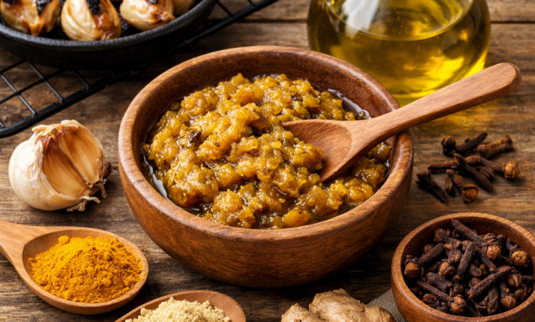 - يُشوى الثوم على نار هادئة أو في الفرن حتى يلين تماماً (لا يُحرق).